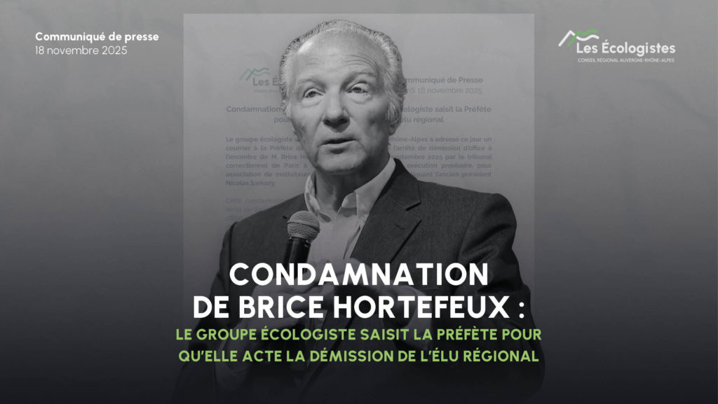 Communiqué de Presse du mardi 18 novembre 2025 Condamnation de Brice Hortefeux : le groupe écologiste saisit la Préfète pour qu’elle acte la démission de l’élu régional Le groupe écologiste au conseil régional Auvergne-Rhône-Alpes a adressé ce jour un courrier à la Préfète de région afin qu’elle prenne l’arrêté de démission d’office à l’encontre de […]